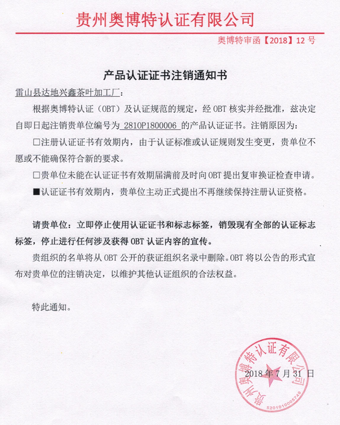 注銷雷山縣達地興鑫茶葉加工廠產品認證證書通知