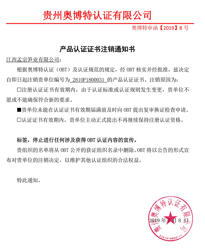 注銷江西孟宗筍業有限公司產品認證證書通知