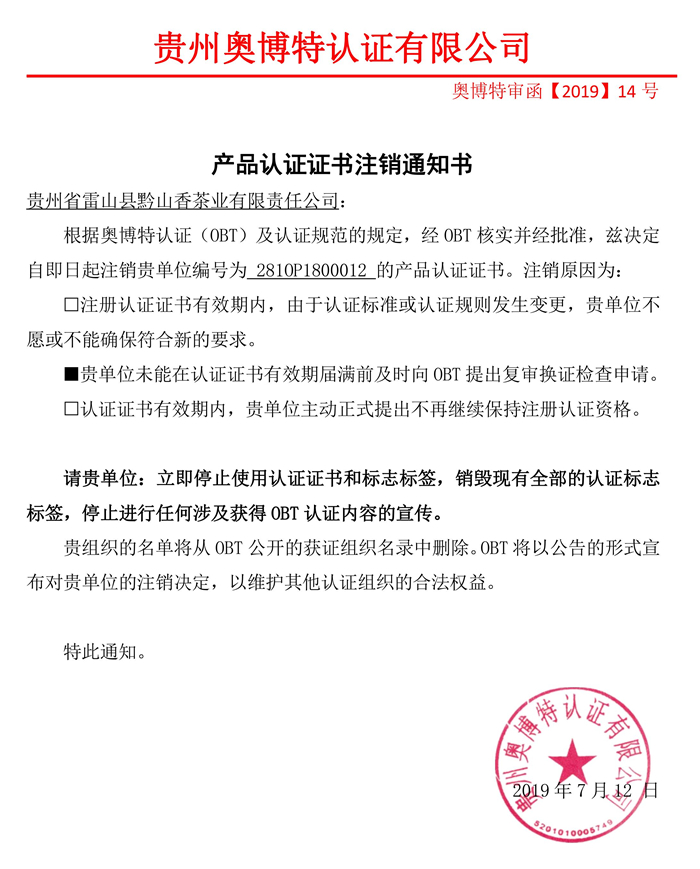 注銷(xiāo)貴州省雷山縣黔山香茶業(yè)有限責(zé)任公司產(chǎn)品認(rèn)證證書(shū)通知