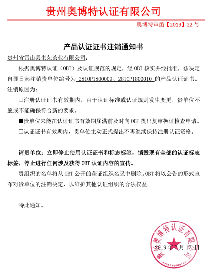 注銷貴州省雷山縣蚩榮茶業有限公司產品認證證書通知
