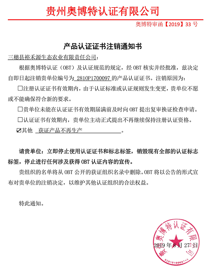 注銷三穗縣裕禾源生態(tài)農(nóng)業(yè)有限責(zé)任公司產(chǎn)品認(rèn)證證書通知