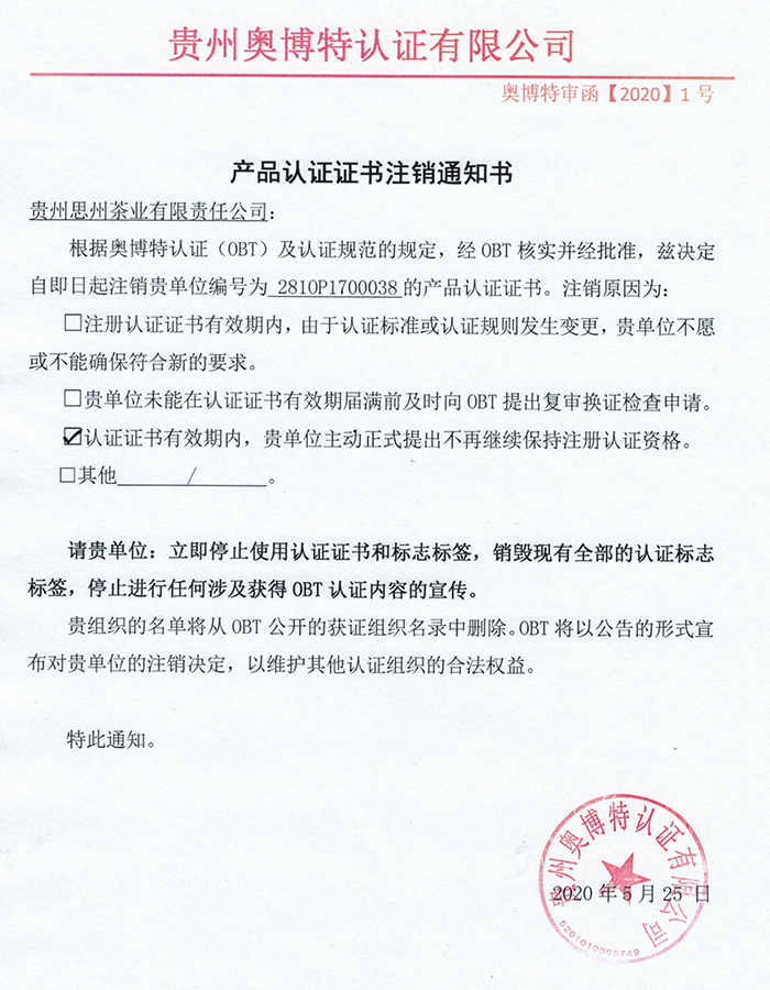 注銷貴州思州茶業有限責任公司產品認證證書通知