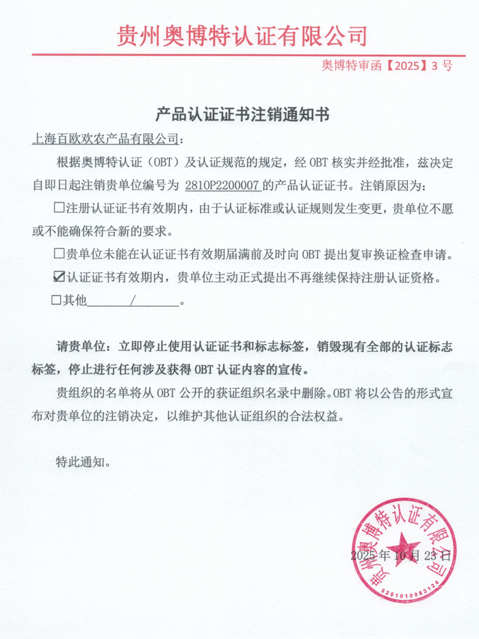 注銷上海百歐歡農(nóng)產(chǎn)品有限公司產(chǎn)品認證證書通知