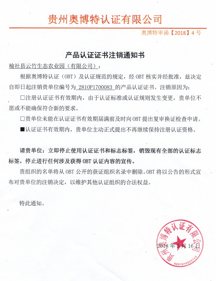 注銷榆社縣云竹生態(tài)農(nóng)業(yè)園(有限公司)產(chǎn)品認(rèn)證證書通知
